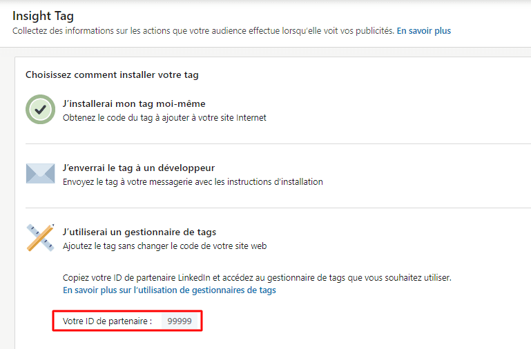 LinkedIn vous fournira un identifiant de partenaire. Vous le retrouverez dans le volet « J’utiliserai un gestionnaire de tags ». Copiez ce code ; c’est ce que vous allez insérer dans votre gestionnaire de tag Google Tag Manager.