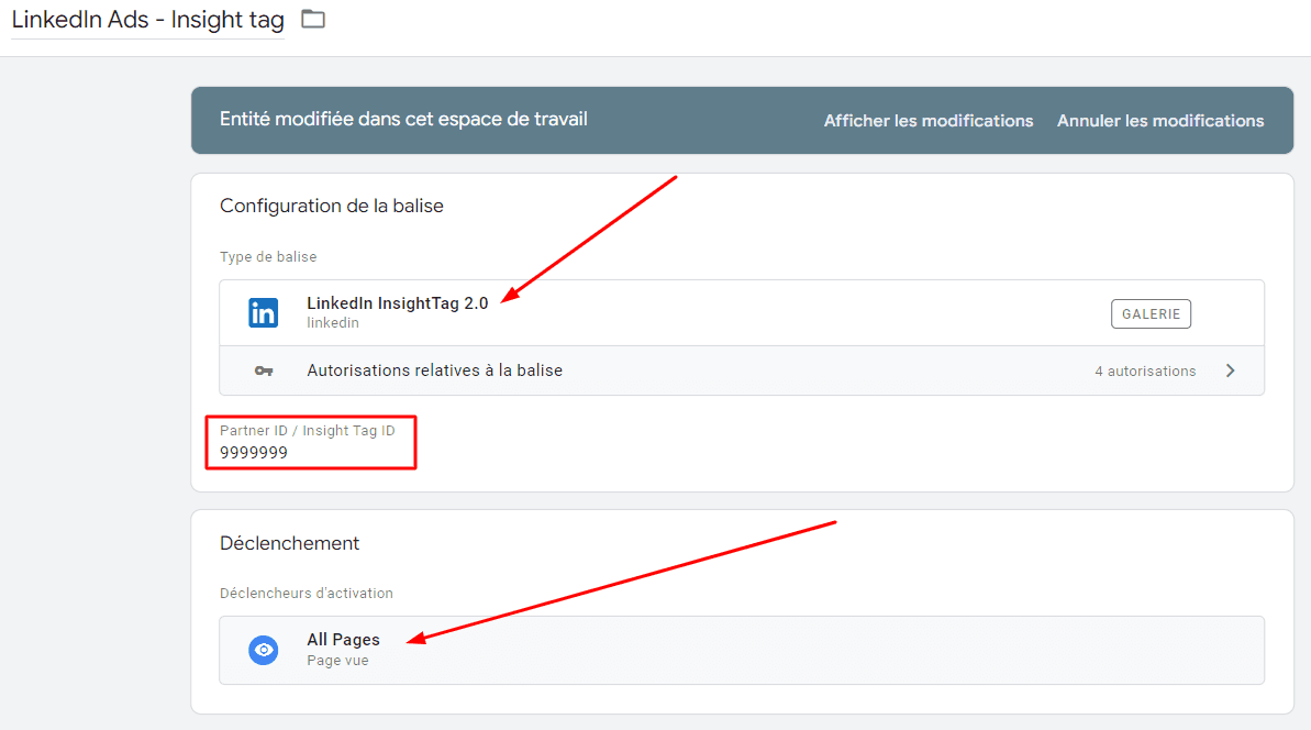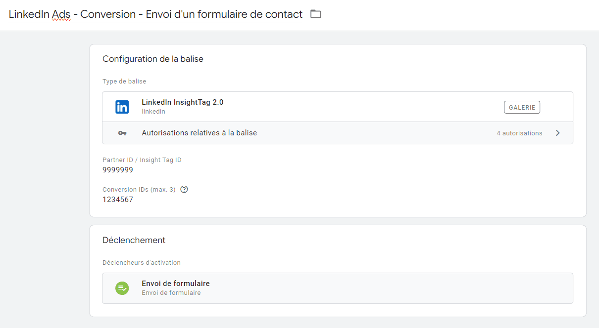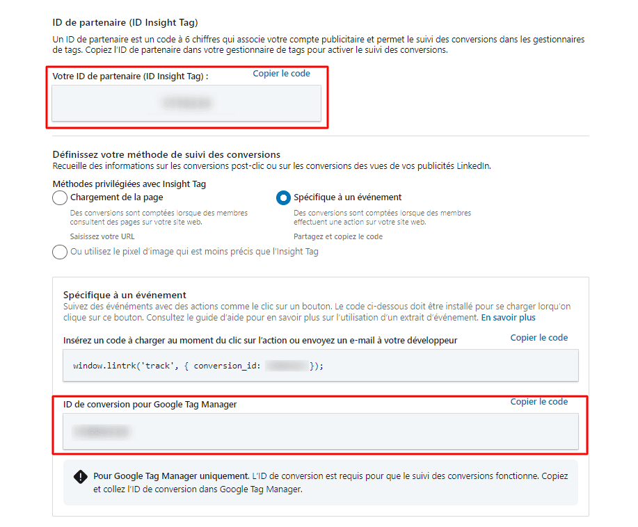 LinkedIn vous donnera alors un second ID : ID de conversion pour Google Tag Manager (en plus de l’ID partenaire vu précédemment).