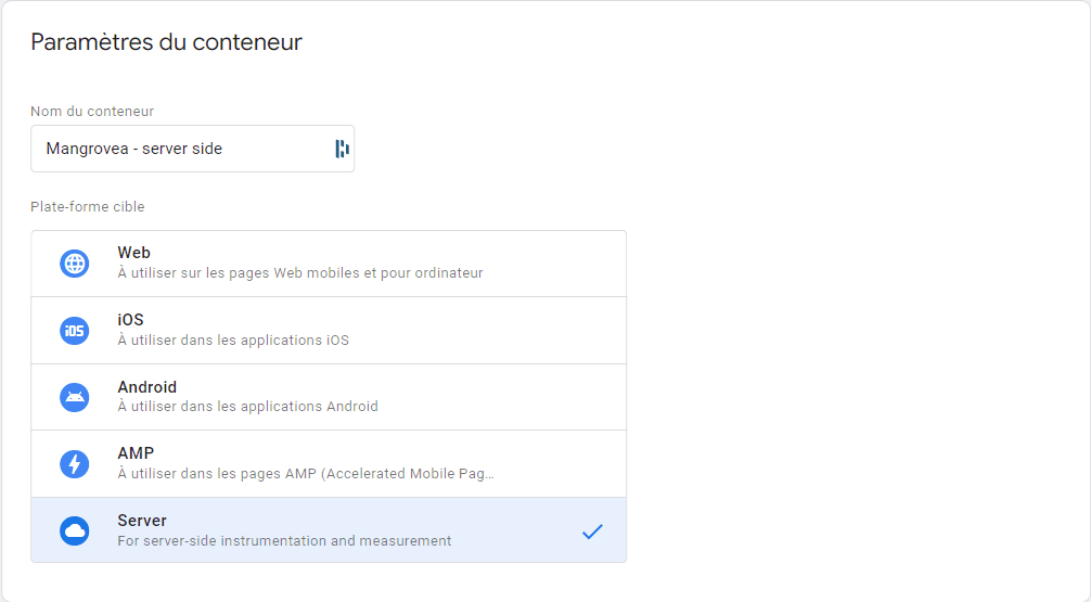 Cette configuration requiers d’avoir un container Google Tag Manager server side créé et hébergé.