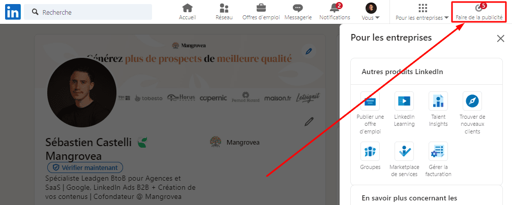 Connectez vous à votre compte LinkedIn et rendez vous dans votre Campaign Manager. Il se trouve dans l’onglet « Pour les entreprises » rubrique « Faire de la publicité ».