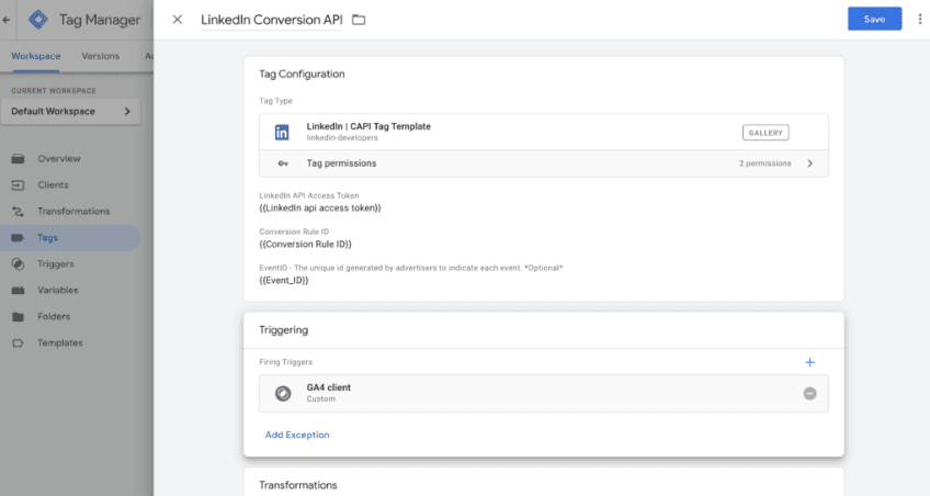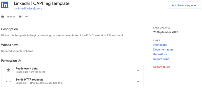 Rendez vous ensuite dans votre container sGTM (Google Tag Manager server-side) et ajoutez une nouvelle balise « LinkedIn | CAPI Tag Template ».