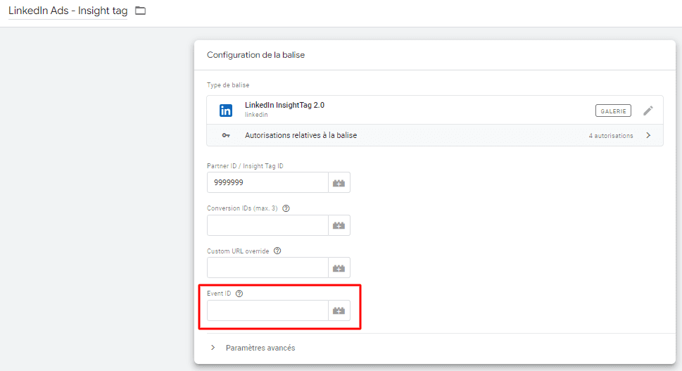 Vous l’aviez peut être déjà remarqué mais lorsque vous configurez votre balise de conversion LinkedIn, il y a un champ dont je n’ai volontairement pas parlé jusque là : L’ID d’évènement.