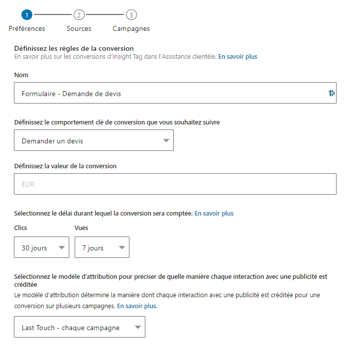 La configuration d’une conversion sur LinkedIn Ads se fait en différentes étapes :