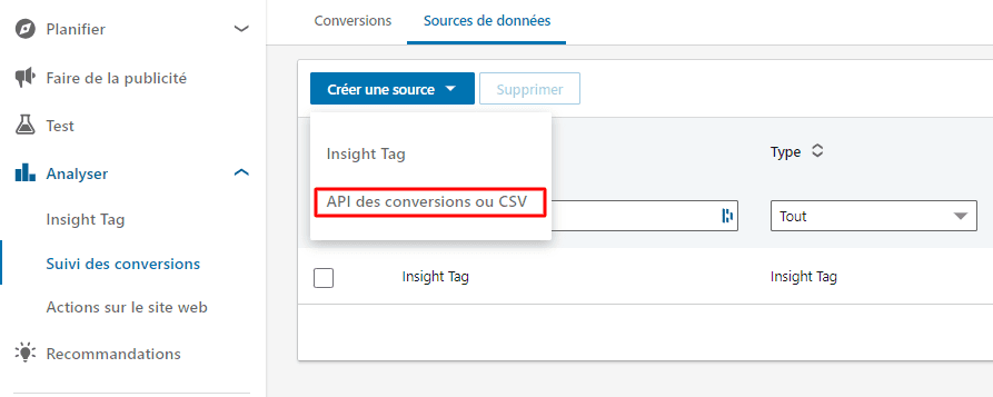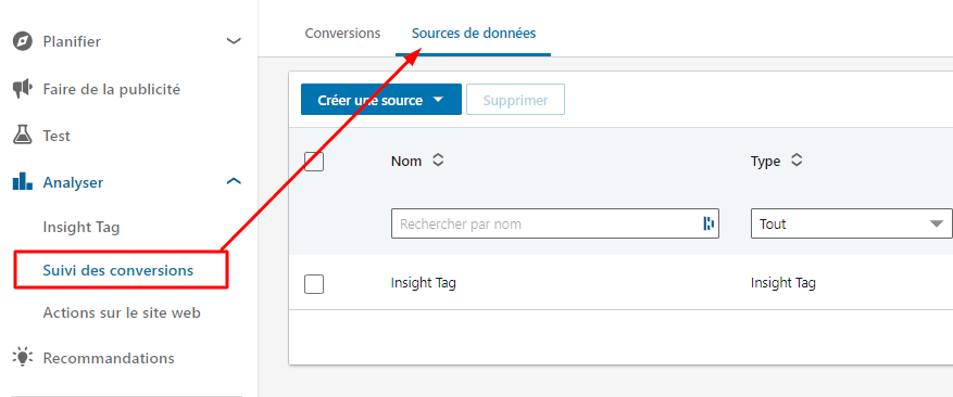Rendez vous dans le menu « Suivi des conversions » et sélectionnez le deuxième volet « Sources de données ». A ce stade, vous ne devriez normalement que voir votre Insight Tag.