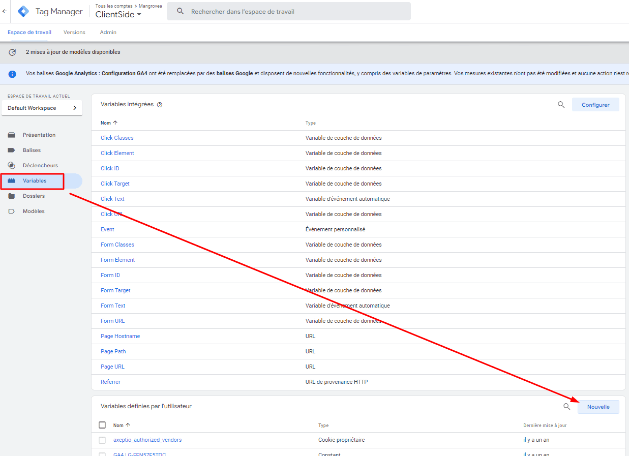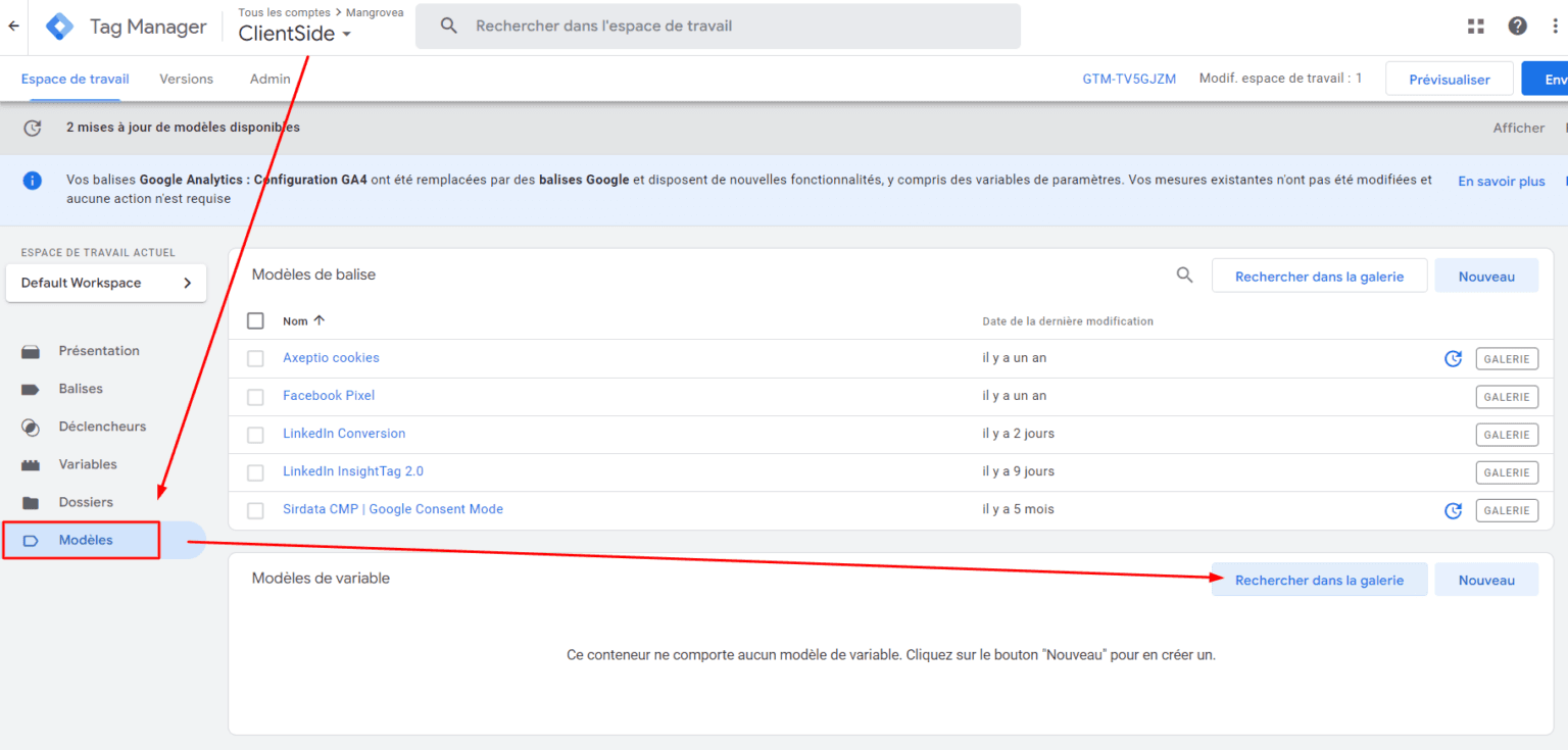 Dans votre container web (client-side), cliquez sur « Modèles », et « Rechercher dans la galerie » des modèles de variables.