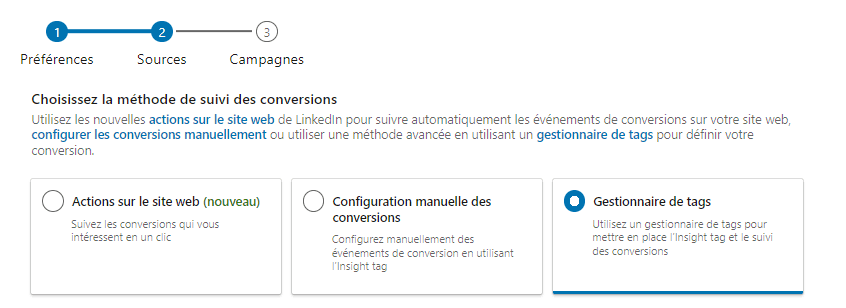 Ces deux options utilisent l’Insight Tag (paramétré précédemment) pour analyser le parcours utilisateur sur votre site et transférer les informations à LinkedIn Ads.