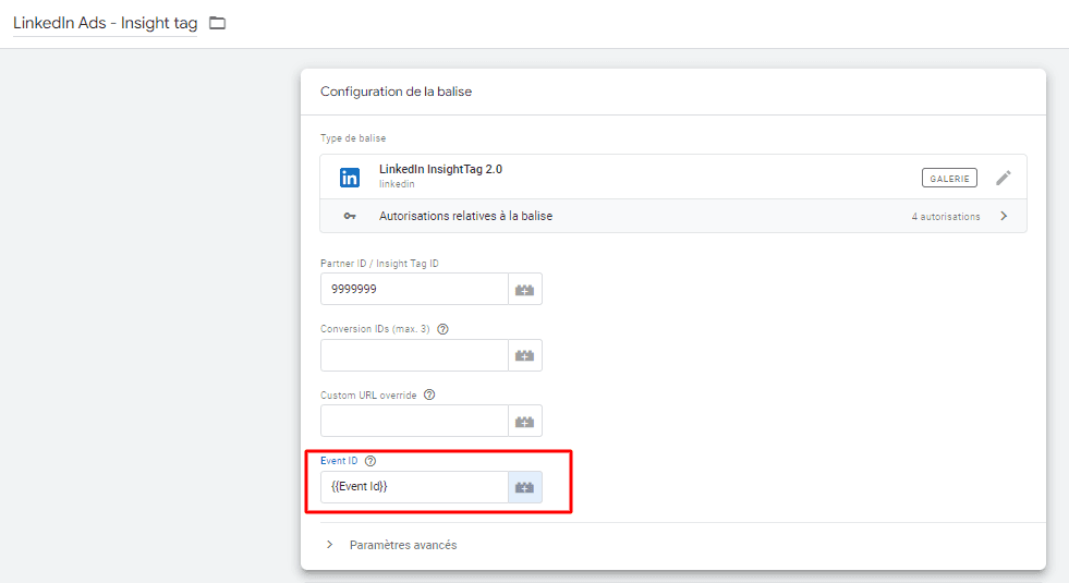 La variable sera désormais disponible pour être ajoutée à votre balise de conversion LinkedIn